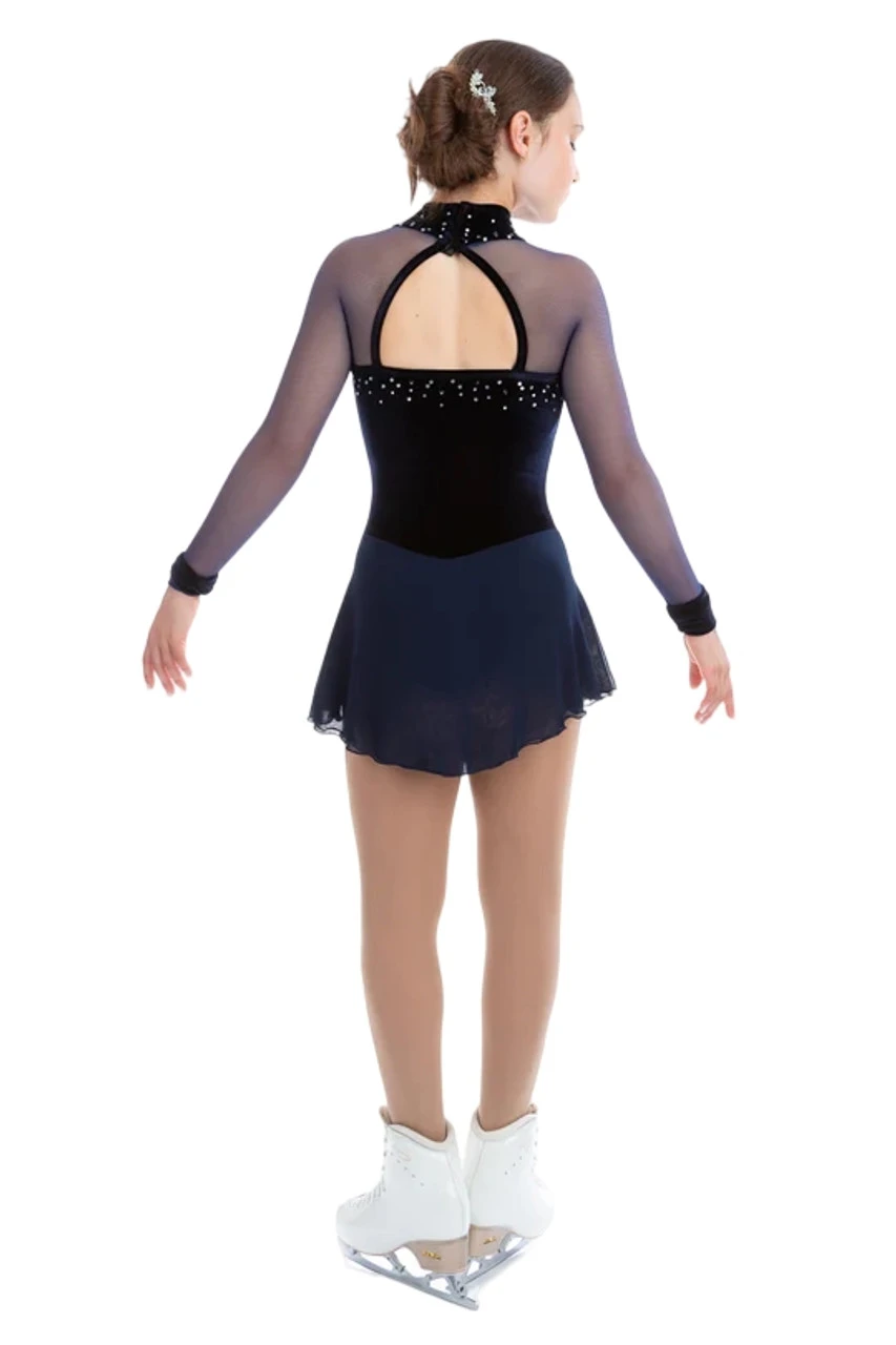 Classical navy velvet dress decorated with rhinestones with mesh long sleeves and wrap chiffon skirt for figure skating Elite Xpression