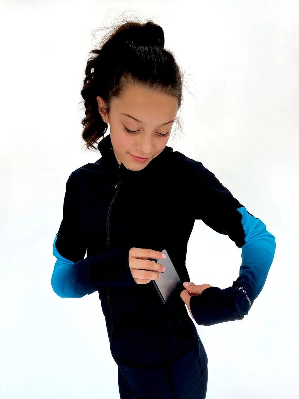 Faded Blue and black figure skating training jacket with side pocket and turquoise and silver color beading accent in the back from the Skate Like a Star Collection from Elite Xpression