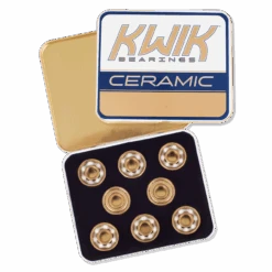Accelerate faster and roll farther with KwiK® Ceramic bearings. These bearings utilize the advanced characteristics of ceramic balls and combine it with a ceramic Titanium Nitride coating on both sides of the bearing shield and the inner and outer bearing races to create remarkable performance. Aside from the striking metallic gold finish it imparts on the surfaces it covers, Titanium Nitride is a corrosion-resistant material that hardens and strengthens the surfaces it is applied to – improving the lifetime durability of the surface by a factor of 4 or more and further increasing maximum roll. KwiK Ceramic bearings, quite simply, are the most advanced ceramic bearings available.